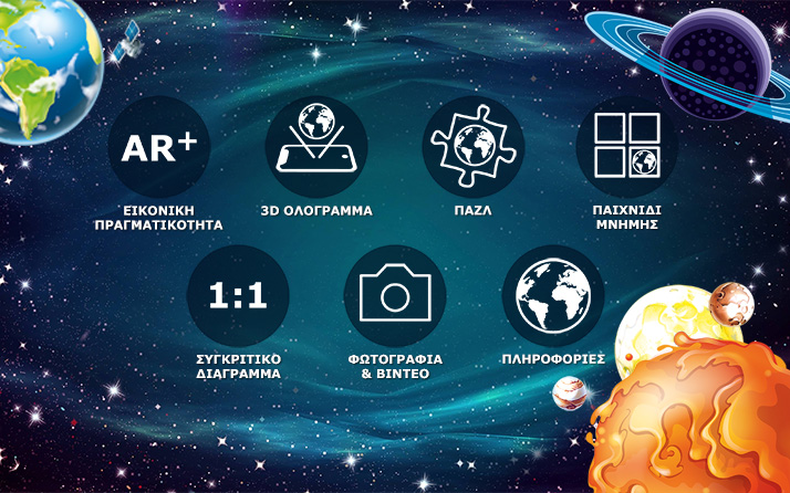 Παρατηρήστε τους πλανήτες σε συνθήκες επαυξημένης πραγματικότητας, δείτε τους τρισδιάστατα, παίξτε με τα παιχνίδια παζλ και μνήμης, δείτε τους από τον μικρότερο στον μεγαλύτερο, φωτογραφηθείτε μαζί τους και μάθετε για αυτούς χρήσιμες πληροφορίες!