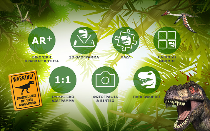 Παρατηρήστε τους δεινόσαυρους σε συνθήκες επαυξημένης πραγματικότητας, δείτε τους τρισδιάστατα, παίξτε με τα παιχνίδια παζλ και μνήμης, δείτε τους σε σχέση με τον άνθρωπο, φωτογραφηθείτε μαζί τους και μάθετε για αυτούς χρήσιμες πληροφορίες!